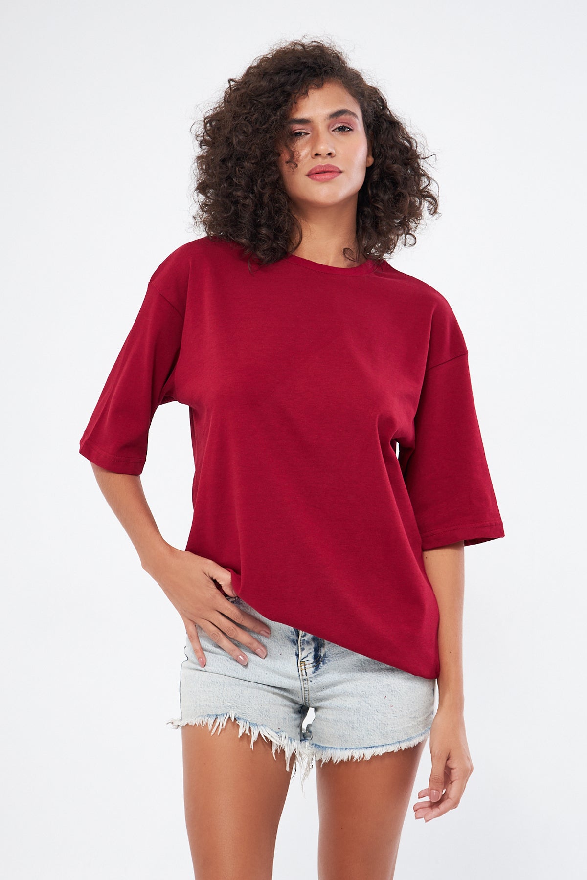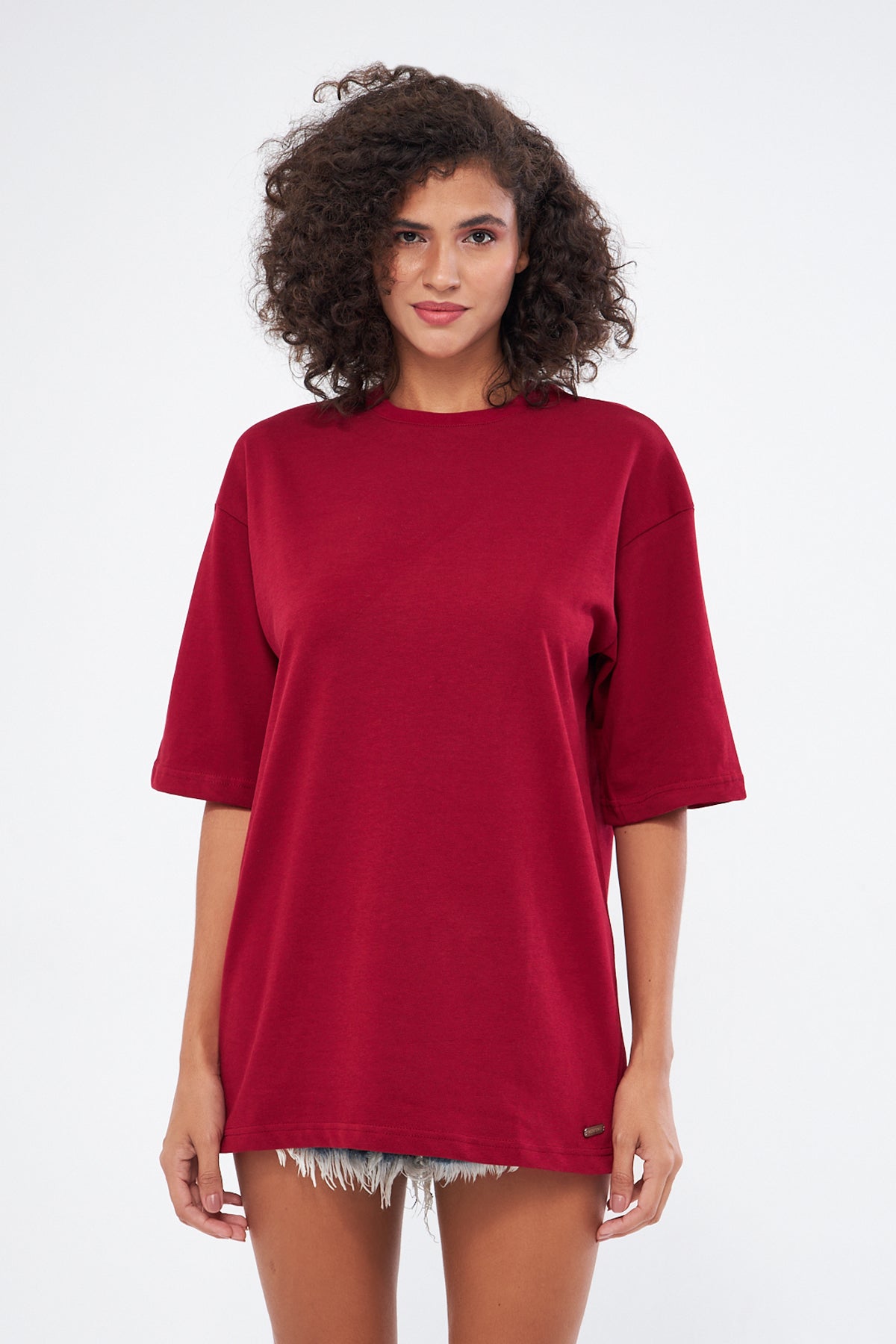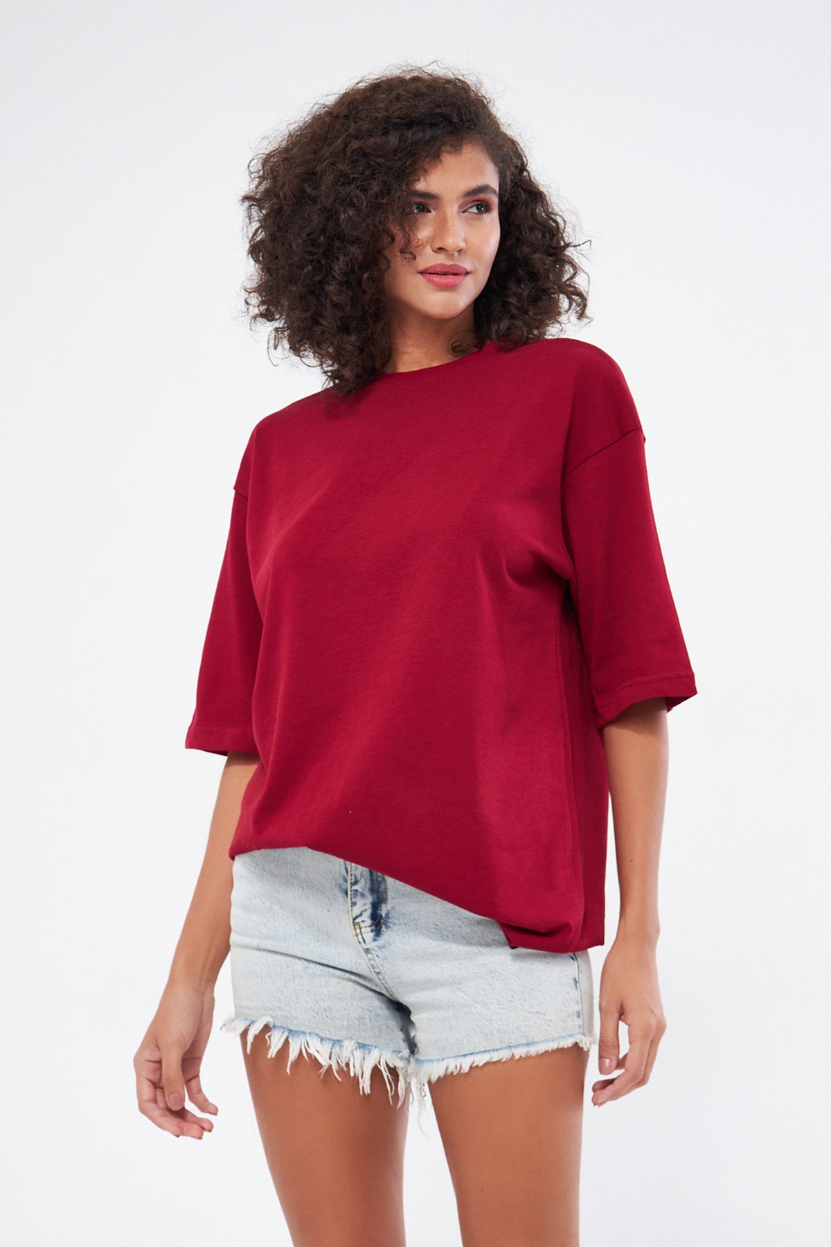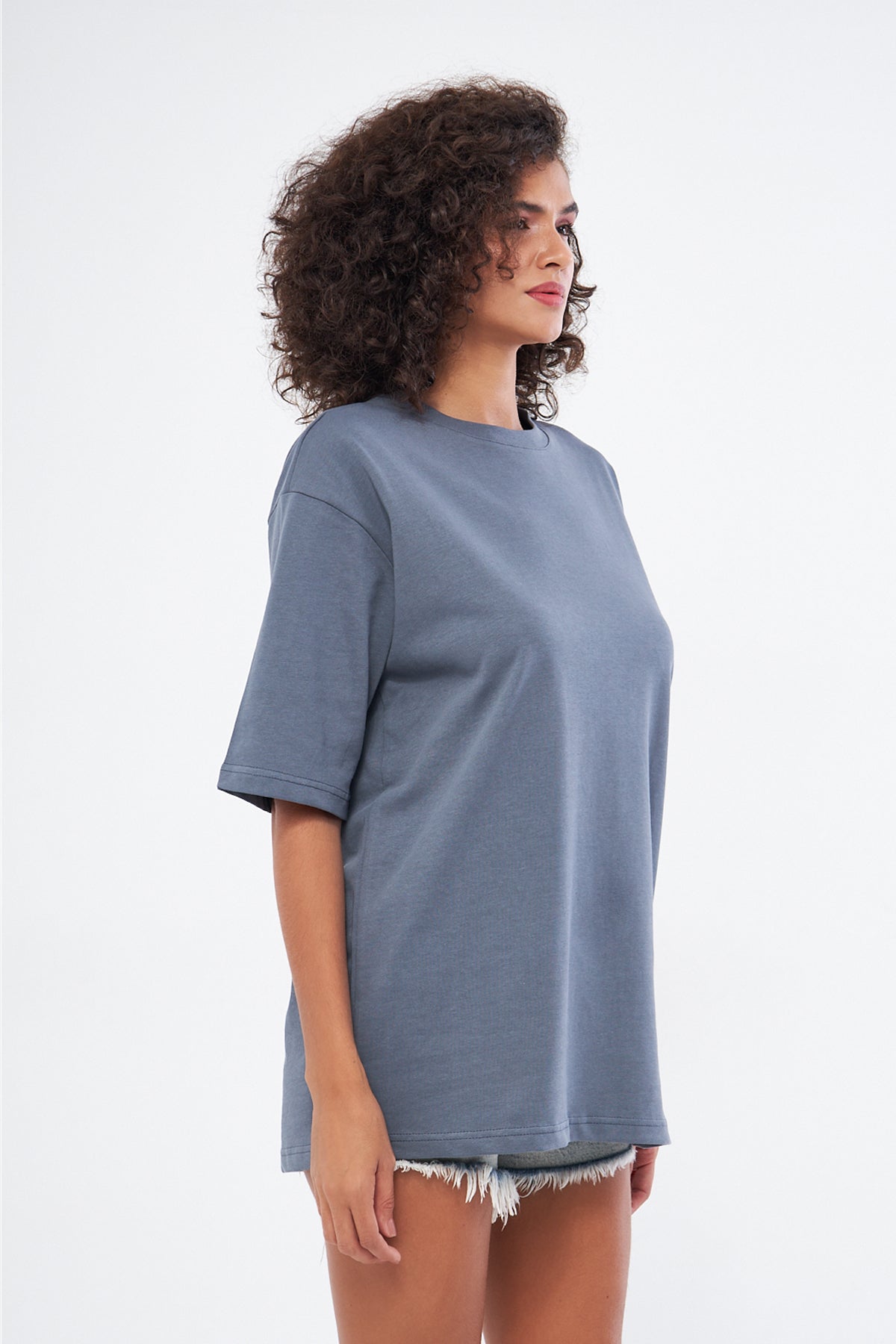This basic t-shirt, with its round neckline and thick fabric, offers both comfort and style. Made from 100% cotton, it provides a soft and breathable texture, making it perfect for everyday wear. The oversized, loose fit ensures comfort throughout the day. You can choose your preferred size by referring to the size chart in the images.
