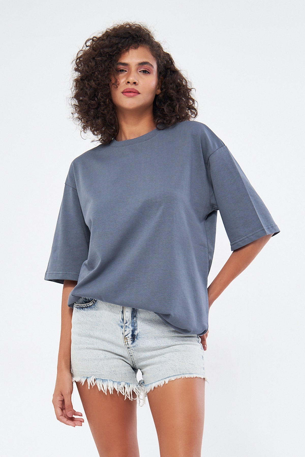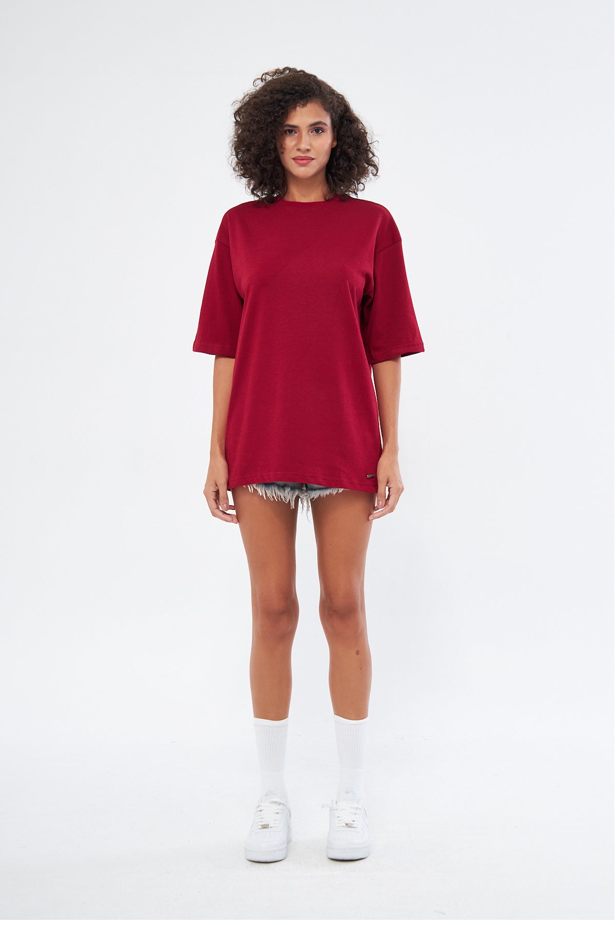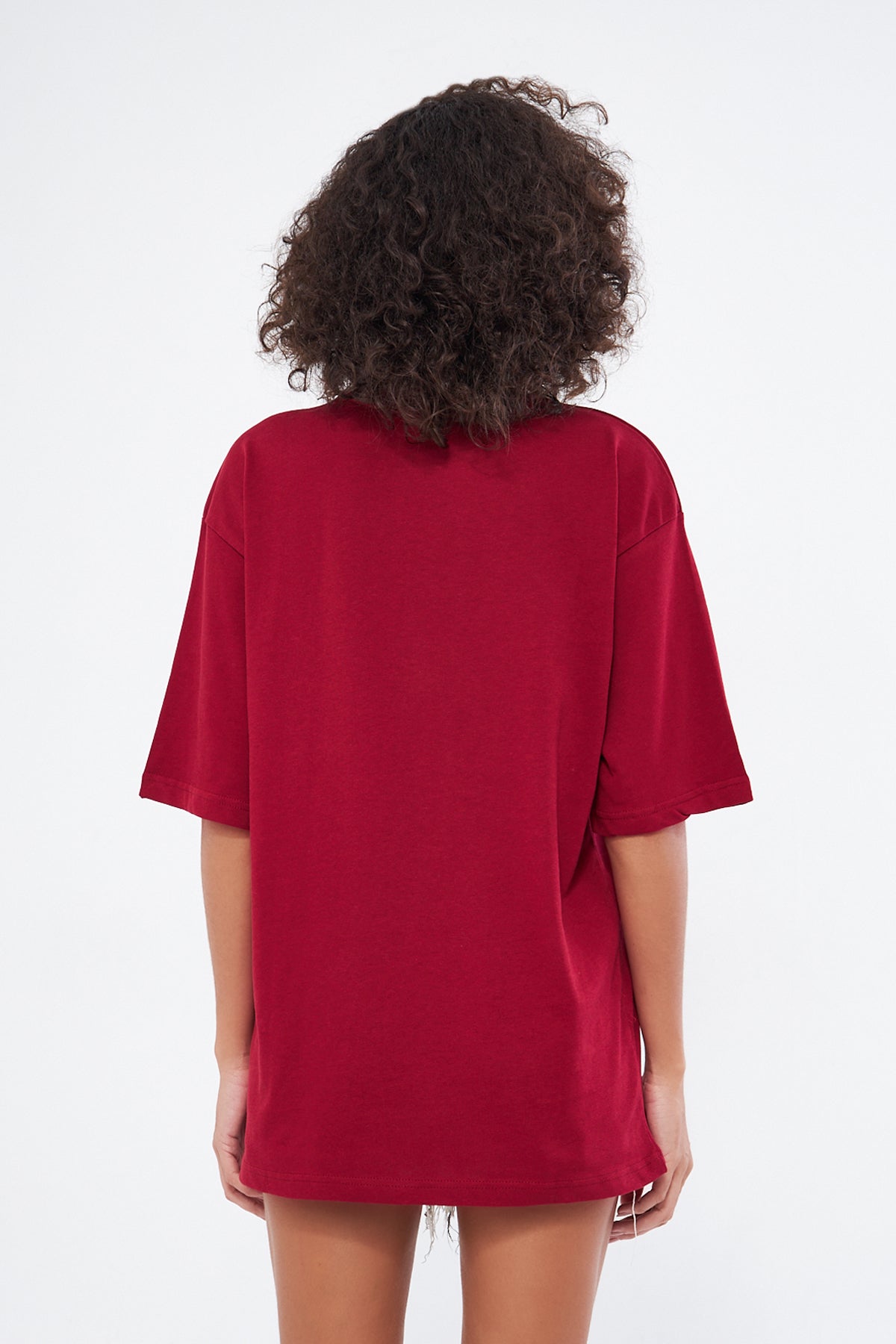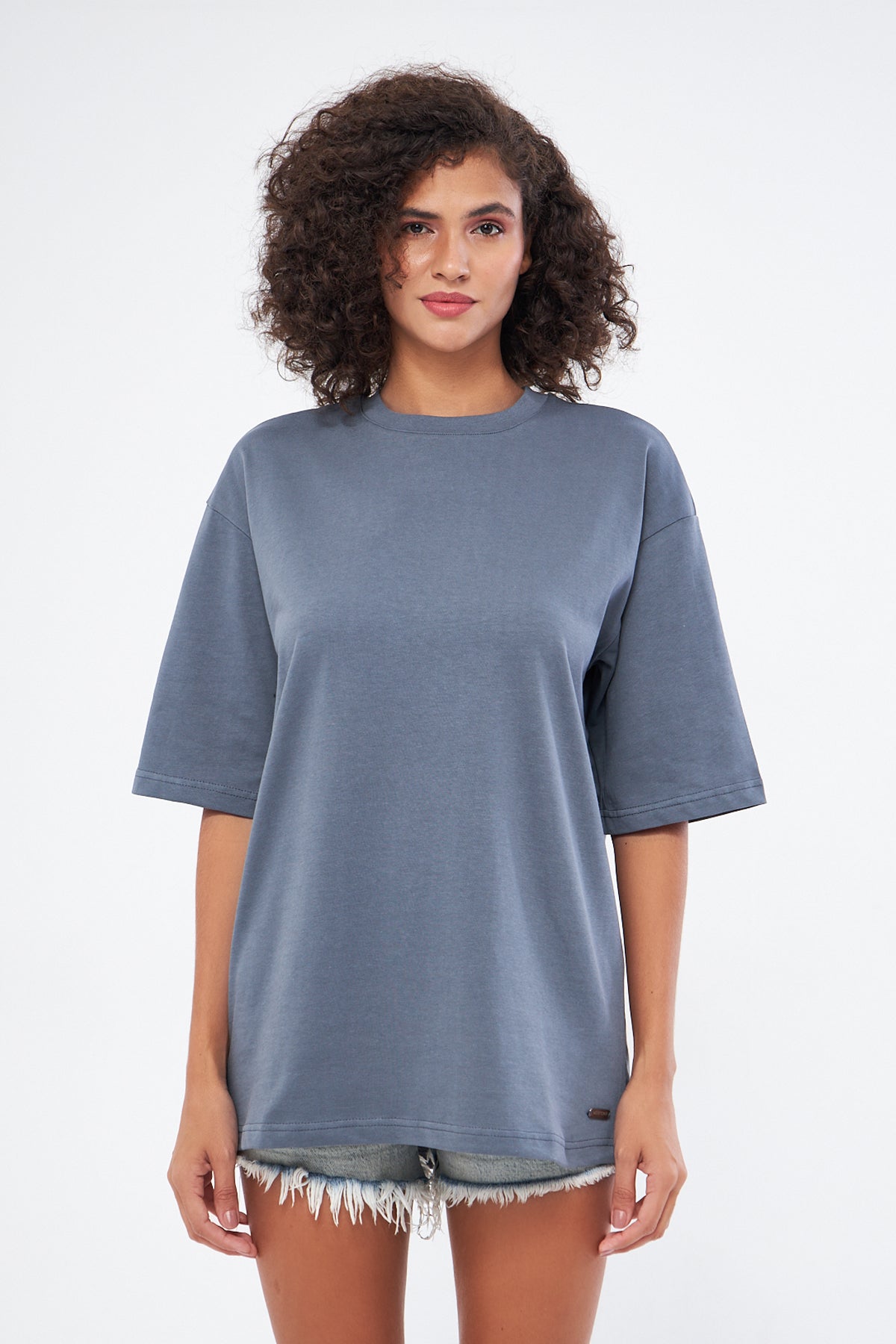 This basic t-shirt, with its round neckline and thick fabric, offers both comfort and style. Made from 100% cotton, it provides a soft and breathable texture, making it perfect for everyday wear. The oversized, loose fit ensures comfort throughout the day. You can choose your preferred size by referring to the size chart in the images.