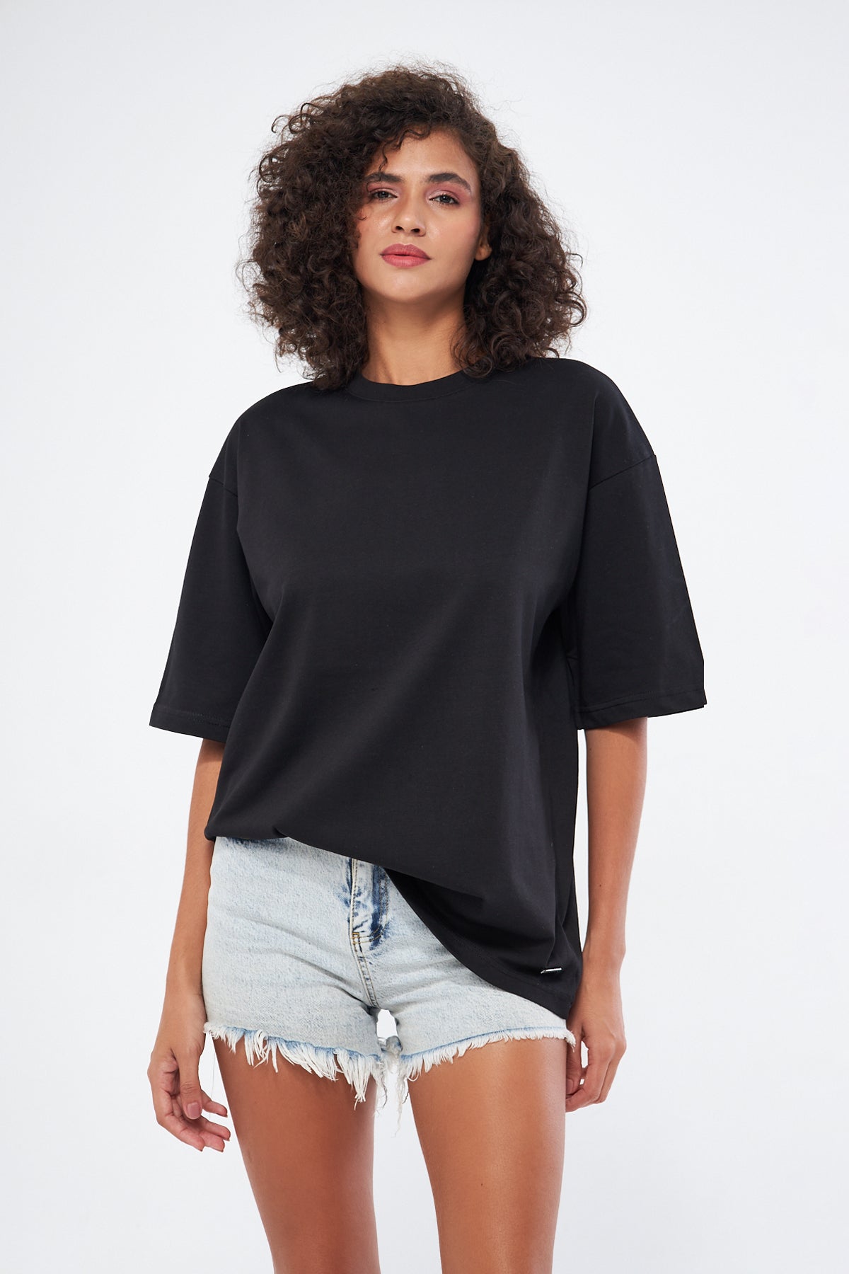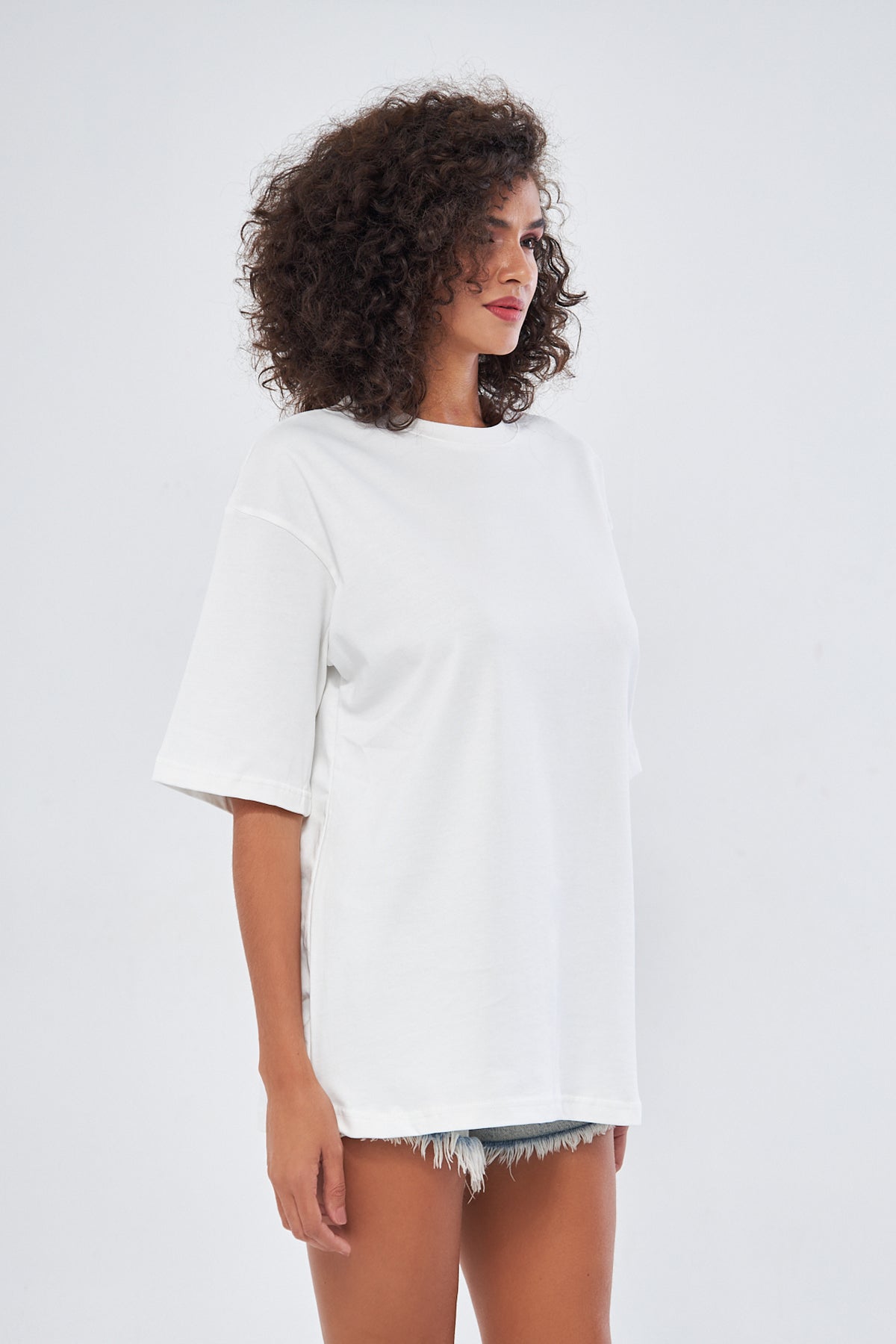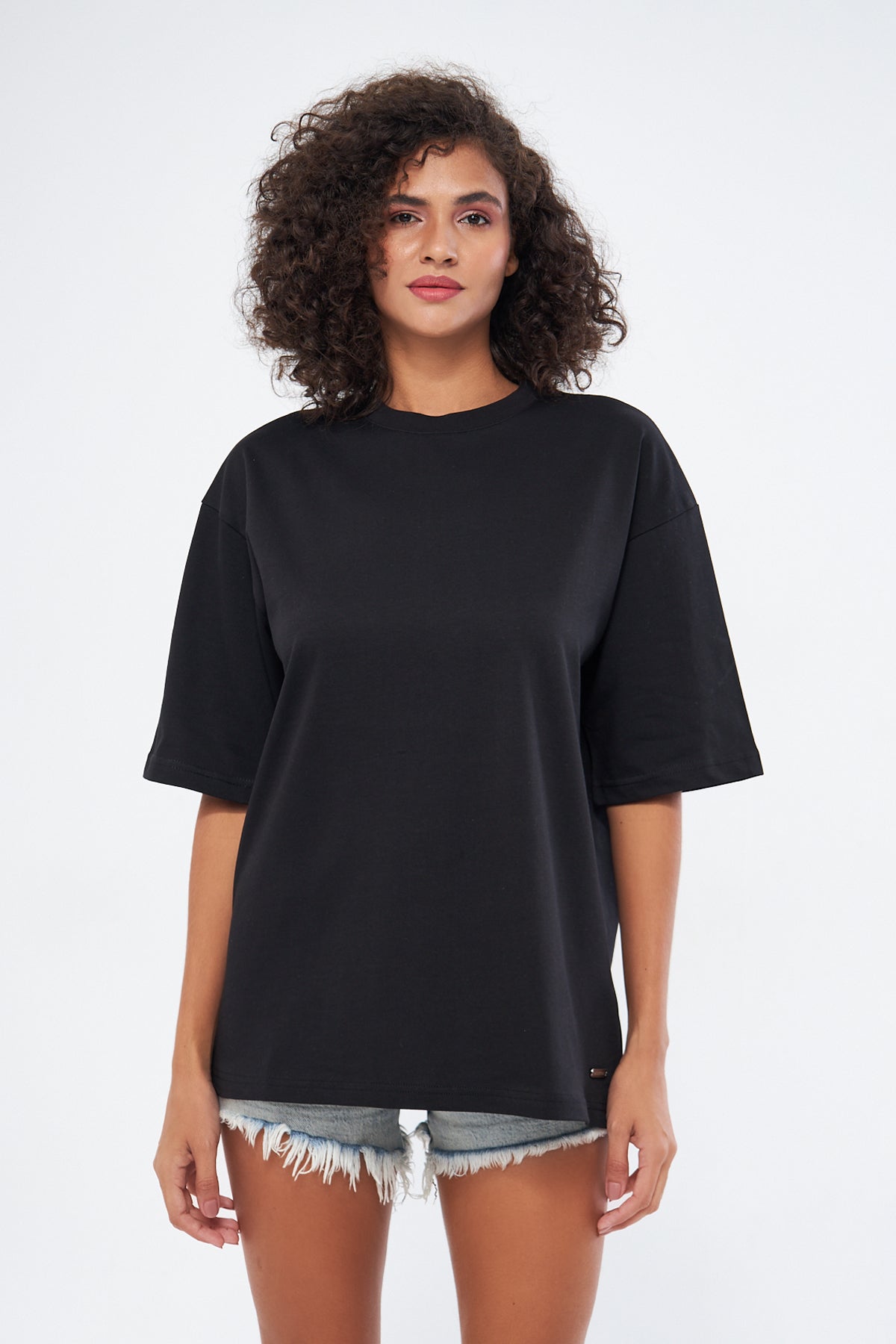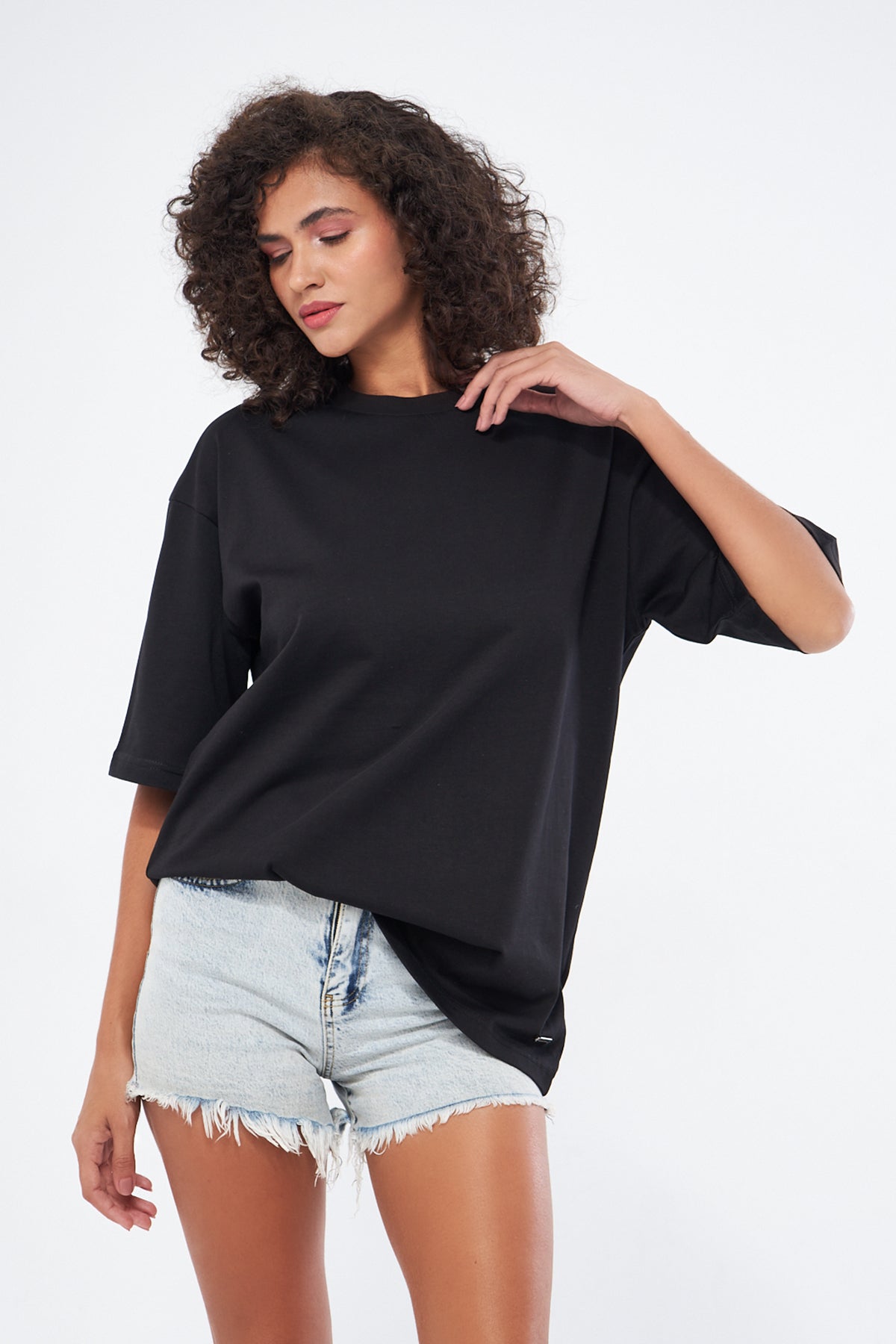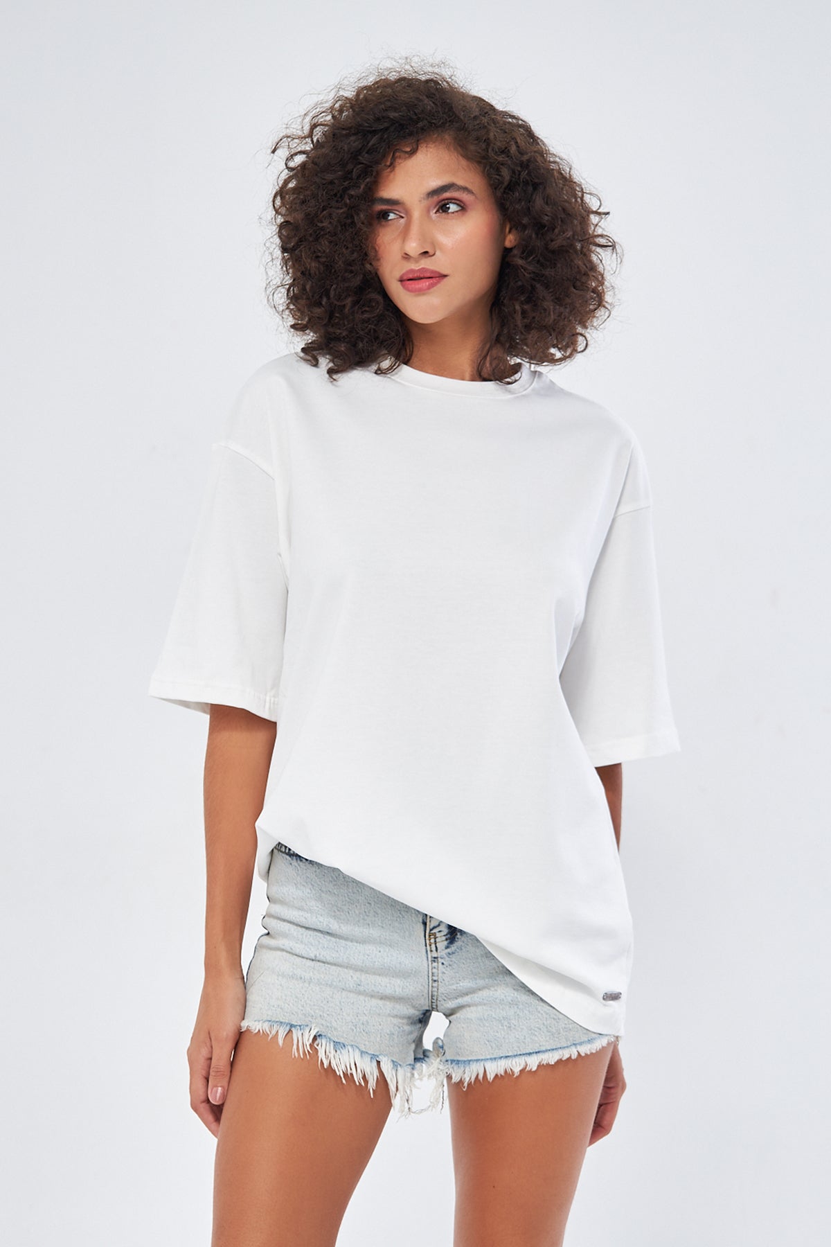 This basic t-shirt, with its round neckline and thick fabric, offers both comfort and style. Made from 100% cotton, it provides a soft and breathable texture, making it perfect for everyday wear. The oversized, loose fit ensures comfort throughout the day. You can choose your preferred size by referring to the size chart in the images.