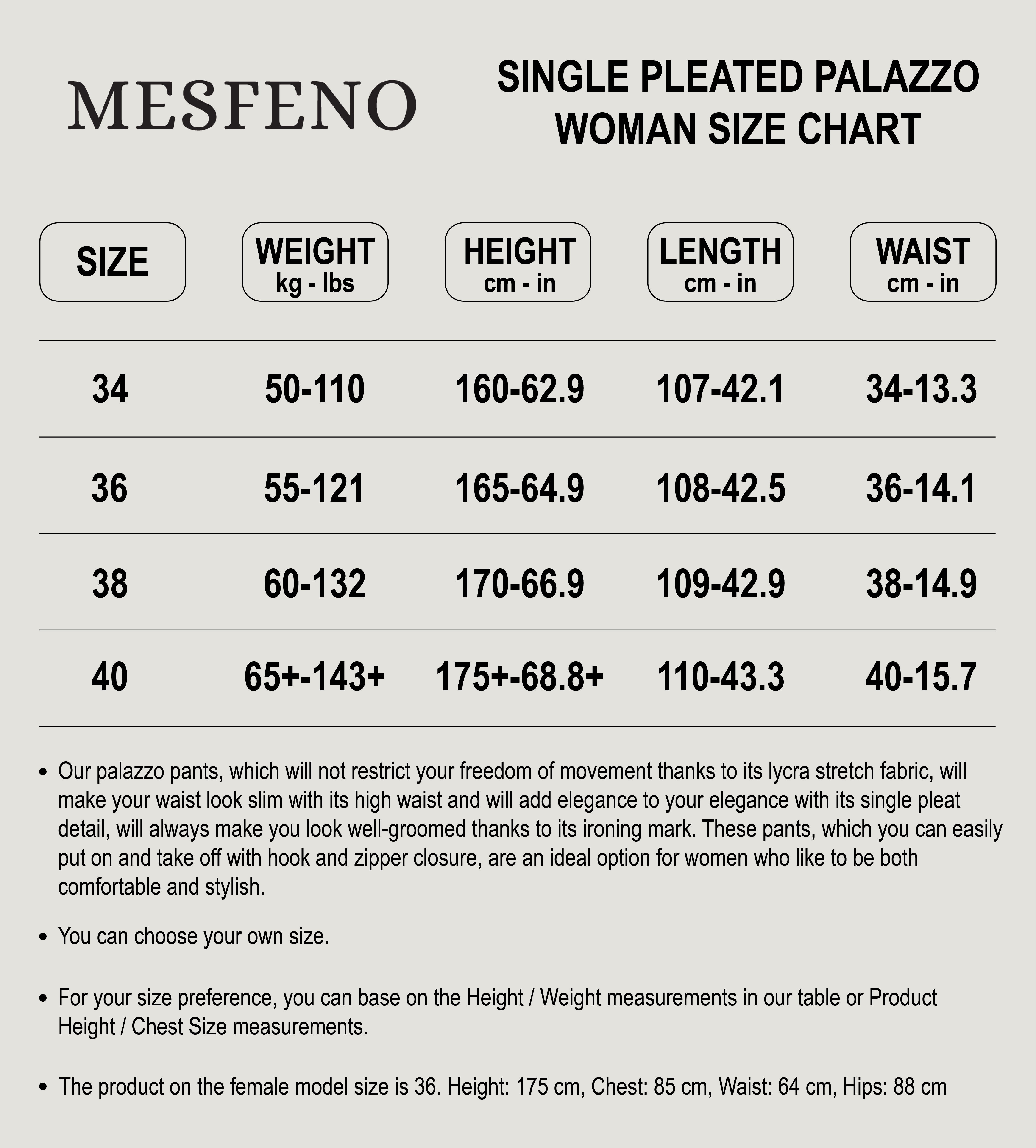 Crafted from stretchy and flexible fabric, these palazzo pants offer unrestricted movement while accentuating your waist with their high-waisted design. The single-pleat detail adds a touch of elegance, and the pressed crease ensures a polished look at all times. Featuring a hook-and-zip closure for easy wear, these pants are the perfect choice for women who appreciate both comfort and style.