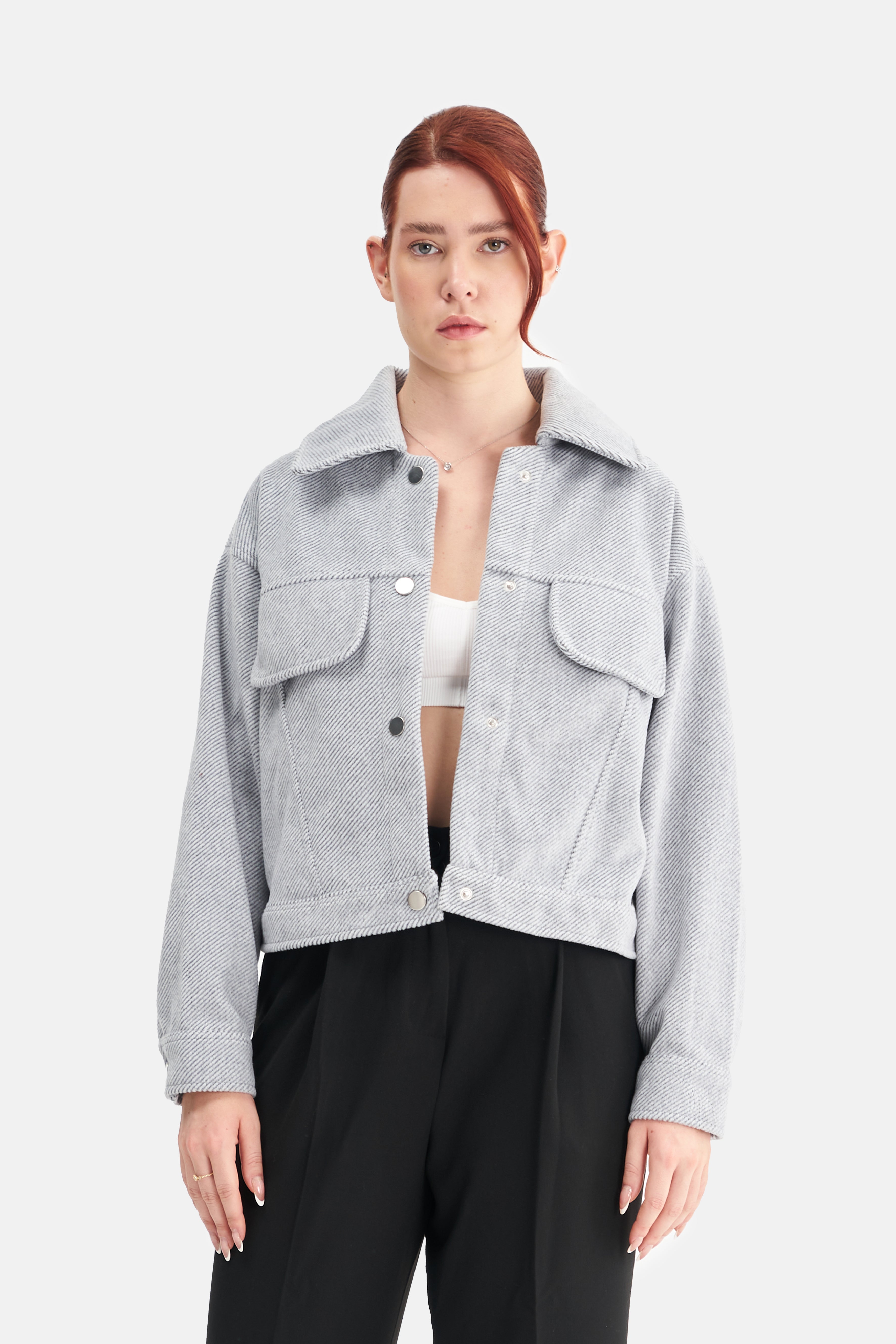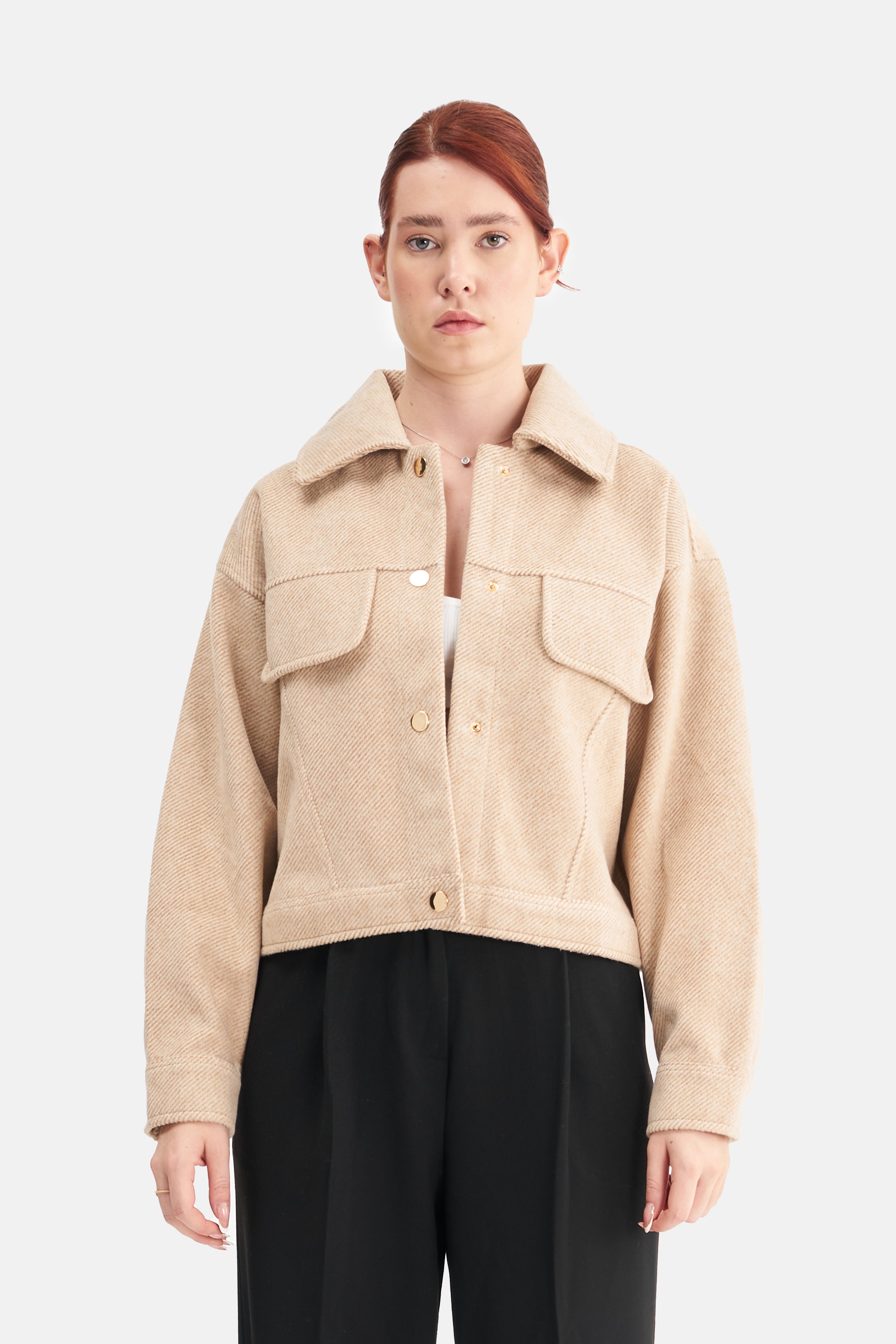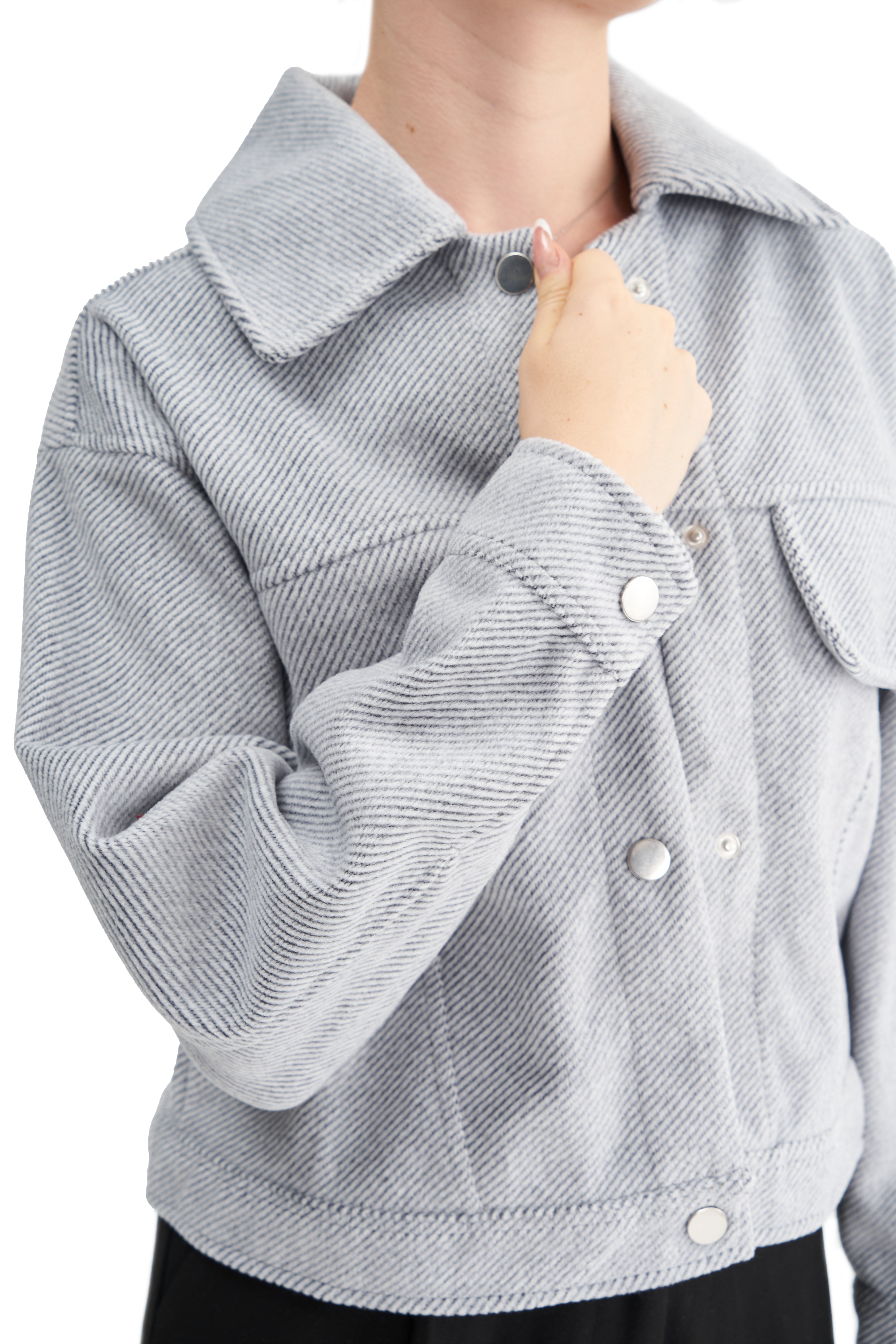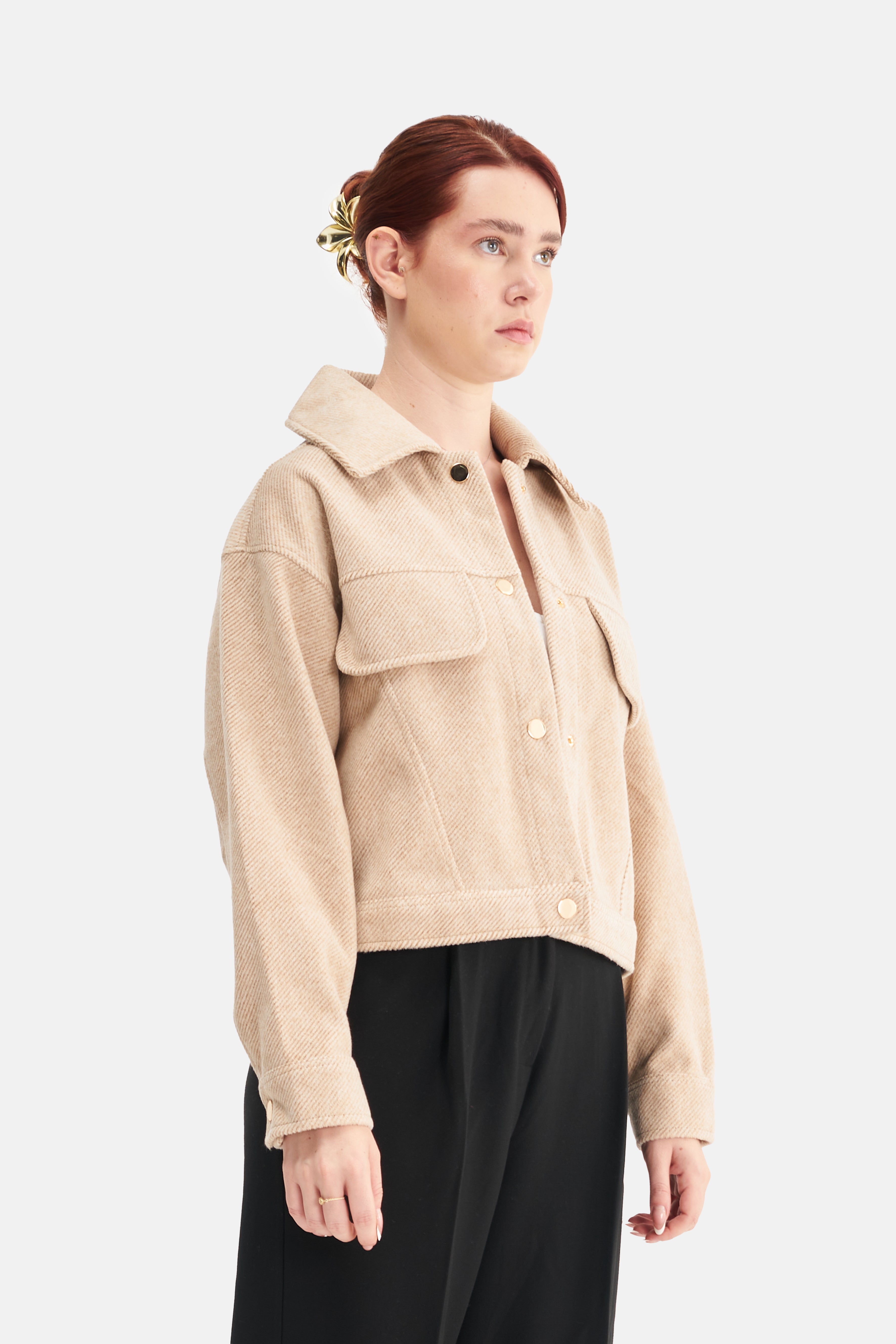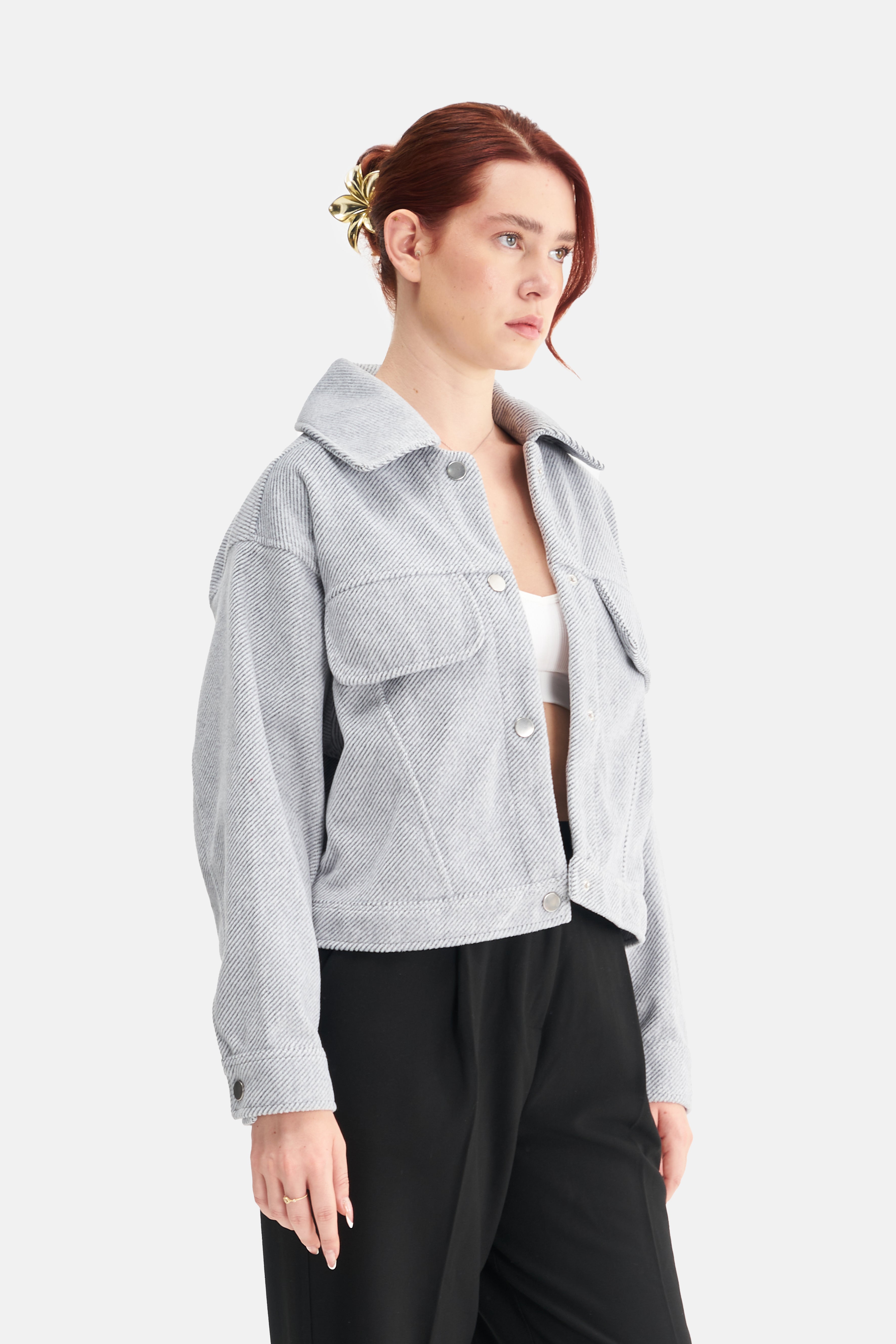 This coat, made from soft wool fabric, provides warmth while offering comfortable wear. Its wide collar enhances the definition of your face, and the decorative flap details add an extra touch of elegance. The snap button closures make it easy to wear and take off, making this coat an essential piece in your wardrobe.